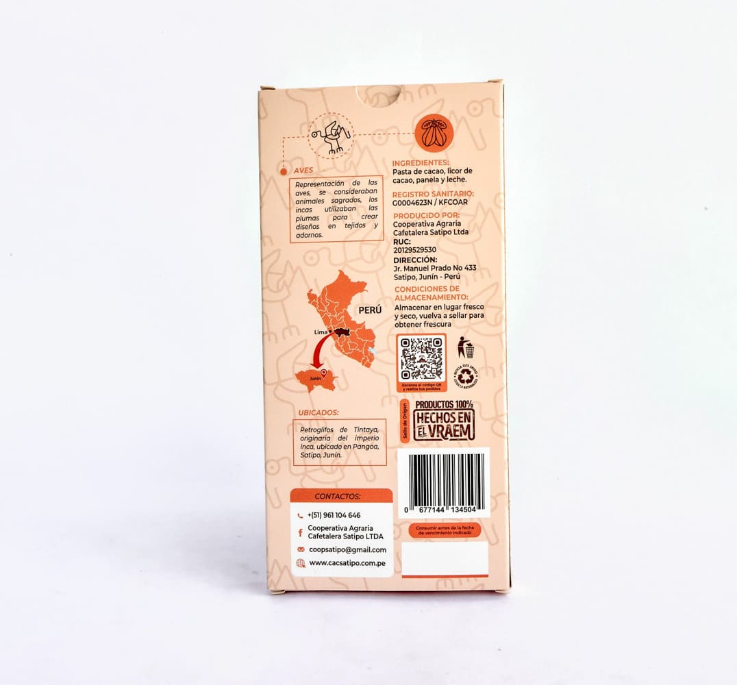 Barra hecha con cacao natural. Alto contenido de teobromina, energizante natural que activa las enzimas de la sinapsis. Es un energizante natural que potencia las actividades físicas y el trabajo prolongado. Conservar en refrigeración en temperatura mínima de 12° C.