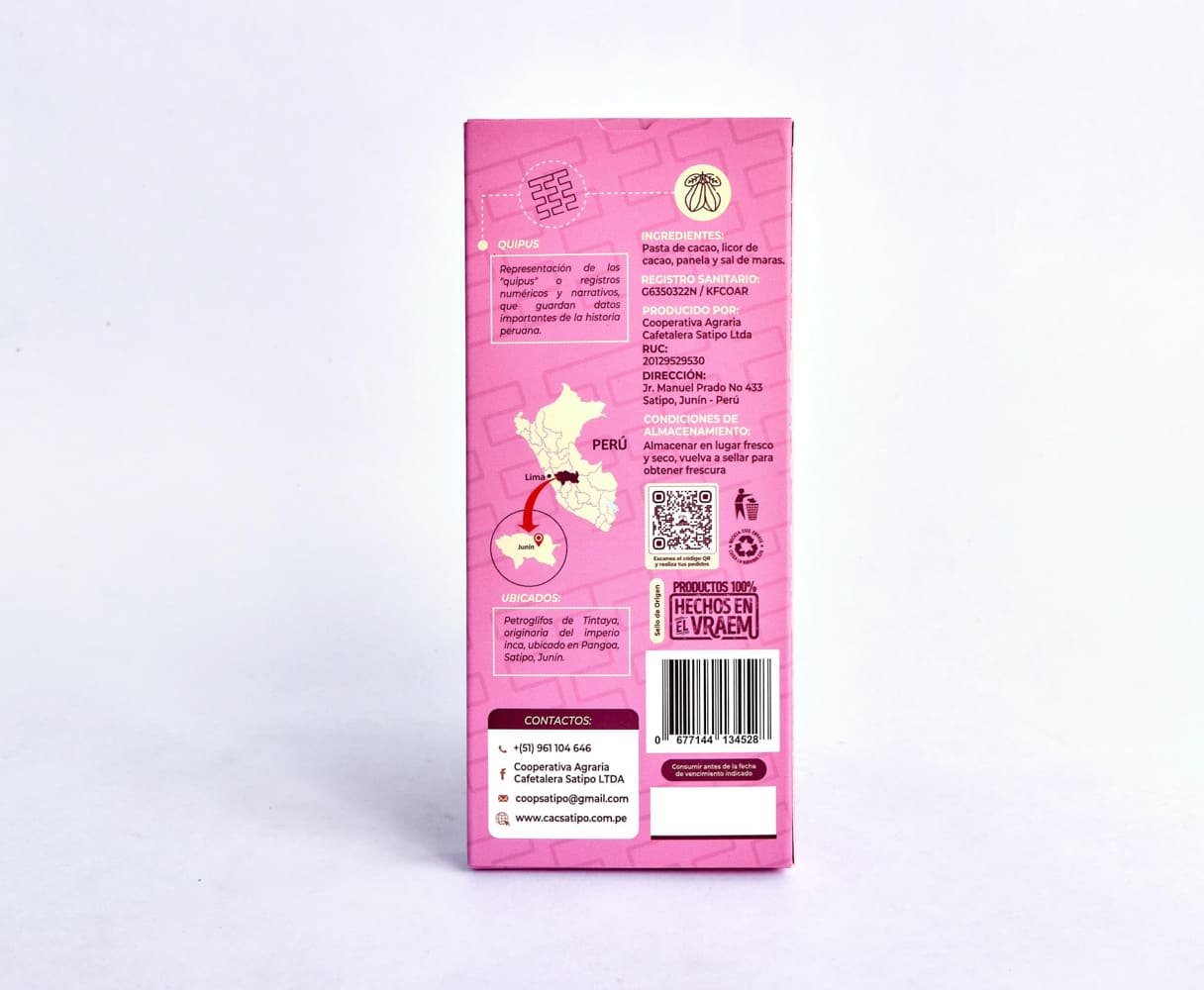 Barra hecha con cacao natural. Alto contenido de teobromina, energizante natural que activa las enzimas de la sinapsis. Es un energizante natural que potencia las actividades físicas y el trabajo prolongado. Conservar en refrigeración en temperatura mínima de 12° C.